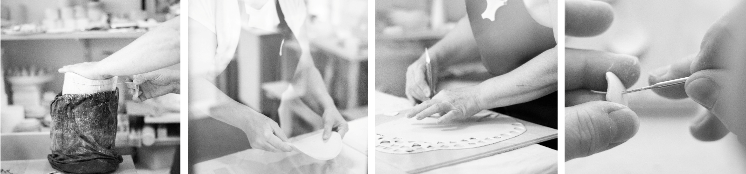 ヴェスナのアクセサリーは、全て手作りです。まずは、陶土をパイ生地のように薄く伸ばします。厚さが均一になるように2枚の同じ厚さの木の板の間に陶土を置き、その木の板の上にローラーを乗せ、ゆっくり転がしながら伸ばしていきます。伸ばした陶土を、今度はクッキーの型抜きのように、それぞれの型で抜き、その後はそれを丸めたり、ピックで模様を付けたり、メタルを通す穴を開けたりしながらアクセサリーの形に整えます。デザインによっては陶土を薄く伸ばさずに、型に入れる事もあります。その場合も、既に出来ている型を使うのではなく、自分で型から起こします。