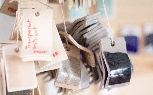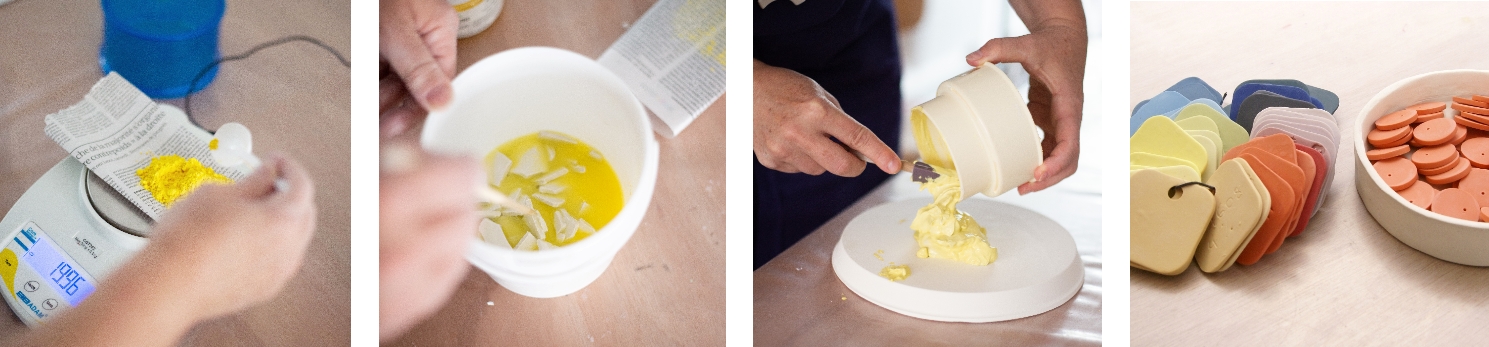 陶土に色を付ける場合は、色素を混ぜ入れます。色素の量により微妙に色の濃さが変わるため、納得の出来る色が見つかるまで、色素の量を変えながら見本を何枚も焼き上げます。