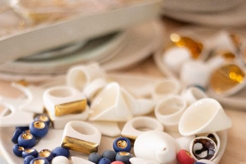 出来たパーツを乾かし、工房に設えた窯で、980度で1回目の素焼きを行います。窯から取り出し冷ました後、釉薬を塗り、今度は1280度で焼きます。金色を施す場合は、先に施した色のない釉薬の上に金の釉薬を重ね塗りし、800度で再度焼きます。焼きあがったパーツを完全に冷ましたら、人工ダイヤの付いた研磨スポンジで一つ一つ丁寧に、表面が滑らかになるまで磨いていきます。最後にもう一度焼き、更に仕上げの磨きをかけ、これでパーツの完成です。出来あがったたパーツを24金メッキを施したメタルと組み合わせ、アクセサリーになります。